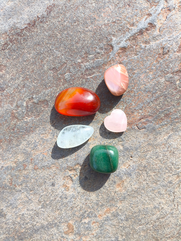 Set para Cáncer con Piedra Luna Melocotón, Cornalina, Cuarzo Rosa, Aguamarina y Aventurina. Calma y contención emocional, comunicación serena e impulso amable para cuidarte y avanzar con seguridad.