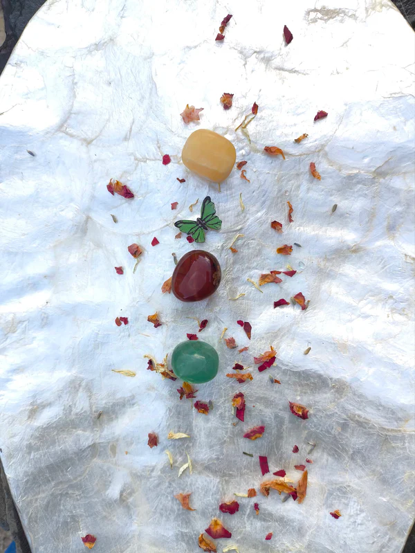 Toma un momento para crear un rincón cómodo. Si te apetece, enciende una vela o una luz cálida. Ten cerca tus piedras (cornalina, topacio y fluorita) y un vaso de agua. Apaga notificaciones y permite que el silencio te acompañe. Si lo deseas, pasa las piedras brevemente por humo de incienso o simplemente sostén cada una unos segundos mientras respiras.
